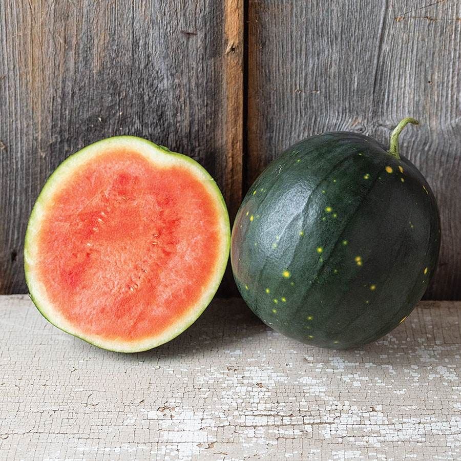 Century Star, an F1 hybrid, is a sweet seedless watermelon similar to Moon and Stars (one of the most popular heirloom varieties in the U.S.). Each round fruit weighs about 10 pounds. The dark green outer rind is firm, waxy, and speckled with yellow spots. The red internal flesh is sweet, crisp, and juicy. Watermelon is a rich source of water and healthy nutrients, including carotenoids (lycopene and Beta carotene), amino acids (citrulline and arginine), and vitamins A, B6, and C.