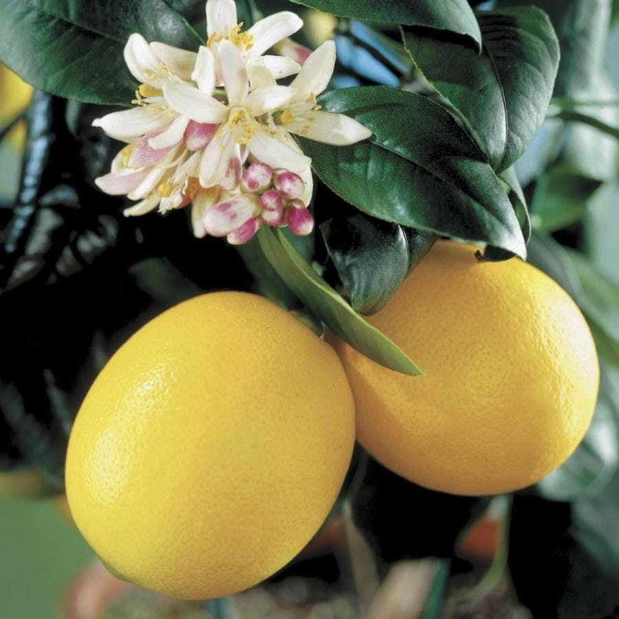 An improved Meyer lemon, Citrus 'Meyer' Lemon Tree is a semi-dwarf cultivar that is valued not only for fruit production but also for ornamental purposes and can fit beautifully into an edible landscape. The tree blooms prolifically in clusters of showy, highly fragrant, waxy white blossoms with yellow anthers. Citrus 'Meyer' Lemon Tree produces an abundant crop of large, rounded fruit with thin skin nearly year-round in warm climates. The fruit is juicier, less acidic, and sweeter than common lemons. The fruit should be allowed to fully ripen upon the tree, becoming golden-hued and soft to the touch.