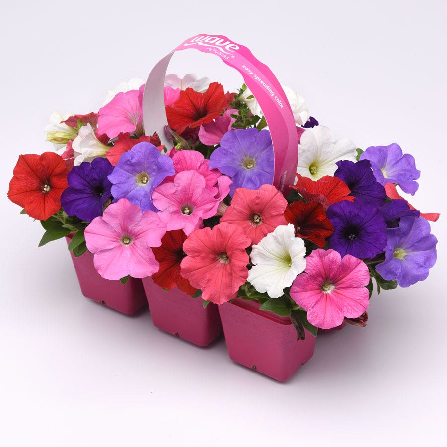Full and lush, E3 Easy Wave® Formula Mixture petunias have an efficient, tight, domed shape; a controlled, spreading habit; and manageable vigor. The plant gracefully cascades from containers, window boxes, and hanging baskets but also makes great edging or ground cover in beds and borders. Planted alongside perennials and vegetables, petunias repel asparagus beetles, leafhoppers, a range of aphids, tomato worms, and many other pests.