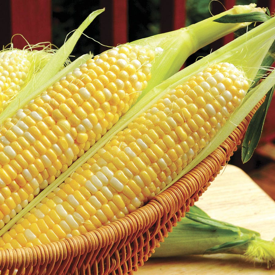 This early maturing, tender bicolor of outstanding eating quality is one of the finest super sweets you will ever grow . . . or eat. The cylindrical 9 inch ears are a pleasure to look at, with 16 to 18 rows of white and yellow kernels?symmetrical, tightly packed, and plump.