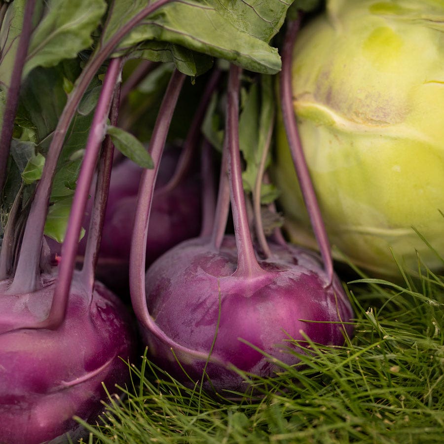 This kohlrabi is named Konstance for a reason: it's reliable! And it has a longer harvest time, with Konstance continuing to produce uniform flat-round globes (think grounded UFOs) that resist cracking and hold their eating quality longer than most after harvest. These long-lasting, 3-inch "bulbs" have white flesh and smooth skin that is a vibrant purple hue, which extends into the stems and leaf margins, producing a lovely leafy plant that fits beautifully into an edible landscape. The bulbs are nearly fiberless and have a crisp texture and a sweet, peppery flavorsimilar to a turnip, but milder and sweeter. A versatile vegetable, kohlrabi is good raw, roasted, or even pickled. Kohlrabi greens are also nutritious and delicious, especially when young and tender, and can be used much like spinach.