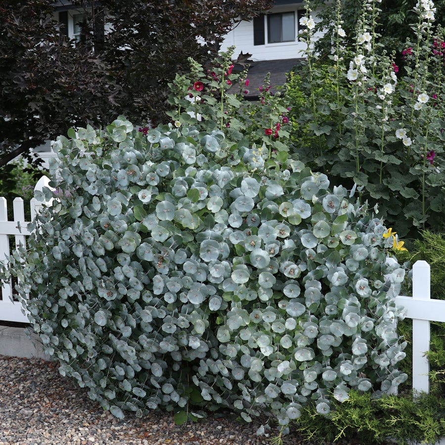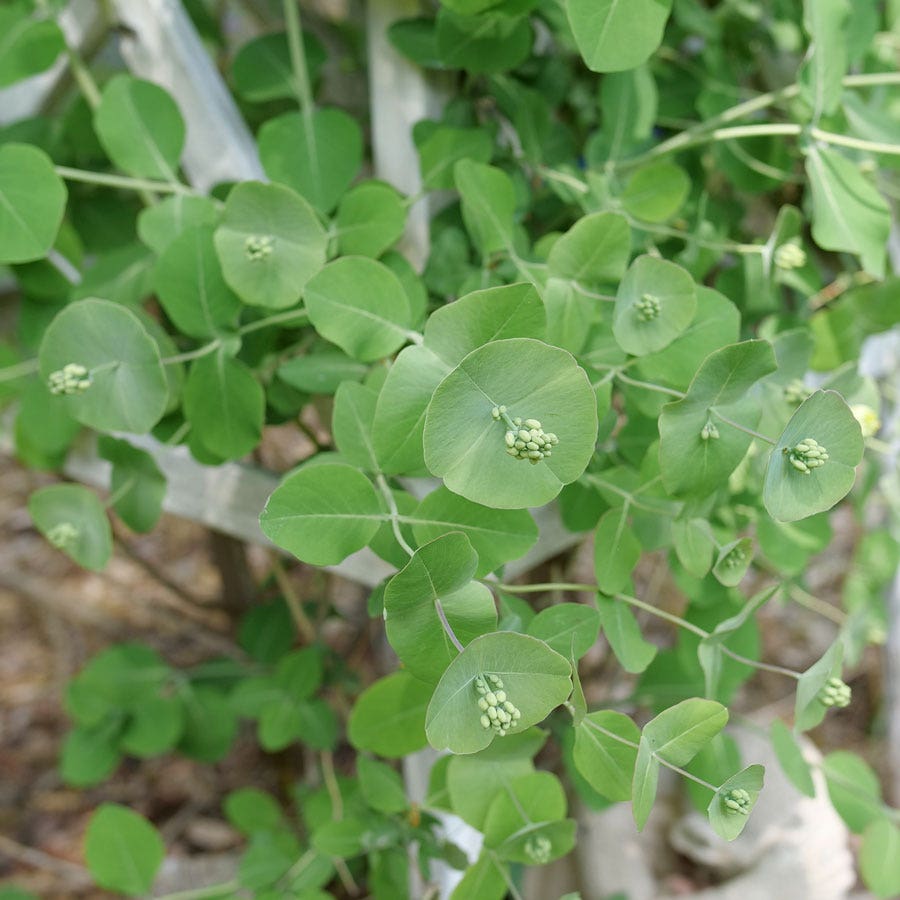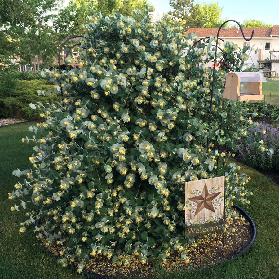 A Proven Winners® ColorChoice® Flowering Shrubs variety, Lonicera Kintzley's Ghost® is a native deciduous perennial vine that blooms in a heavy early summer flush of tubular yellow flowers arranged in terminal clusters. The nectar- and pollen-rich flowers have a light scent and entice pollinators, including bees, butterflies, and hummingbirds. But it's the unique showy bracts that surround the flowers that really steal the show. The silver dollar-sized bracts look similar to eucalyptus with their circular shape and ghostly greenish blue color. They remain on the plant until it defoliates in autumn and make a beautiful backdrop for the glistening red berries that follow the flowers.