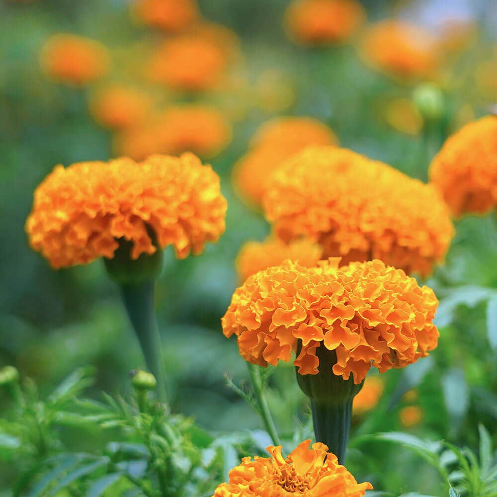 These bright orange flowers are simply stuffed with short, quilled petals, so symmetrical and beautifully rounded that they scarcely look real. A closely-spaced planting of Park's Whopper is a real delight, because when the plants begin blooming, you literally have a solid wall of flowersno foliage or ground visible in between.
