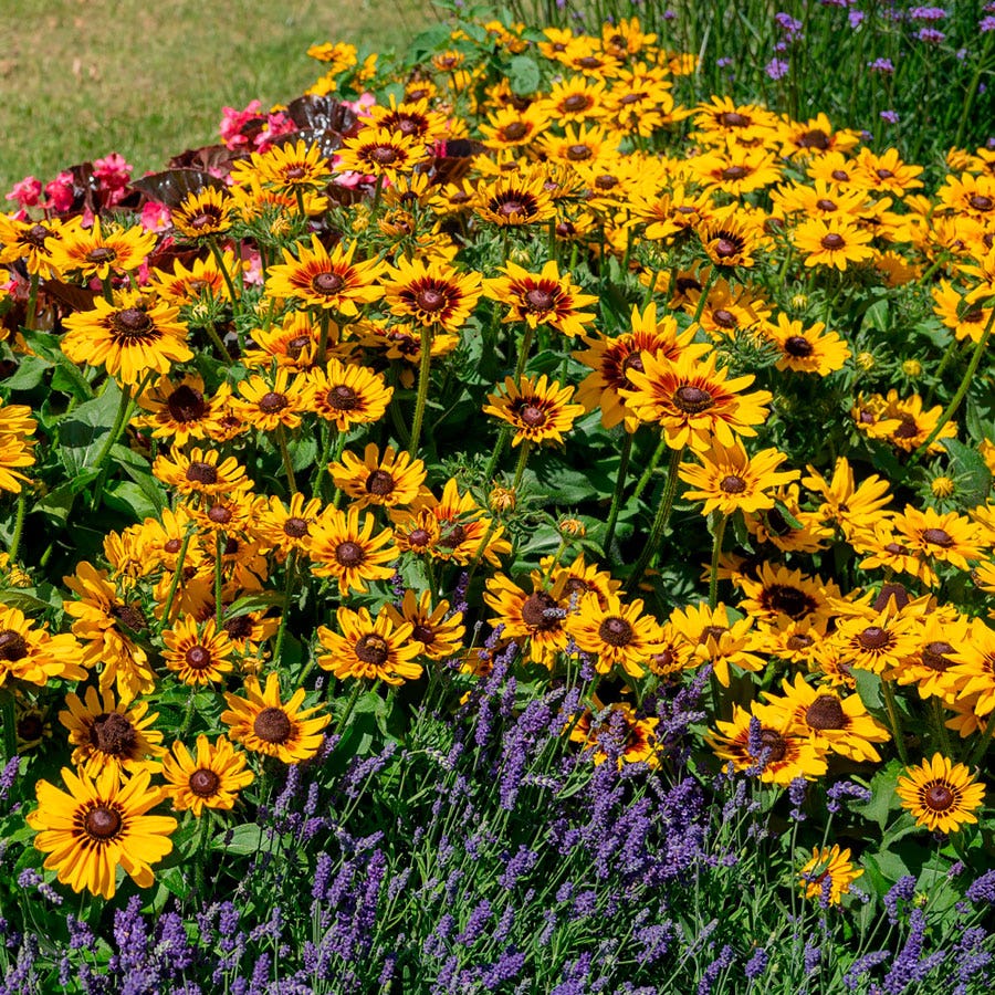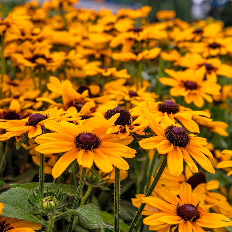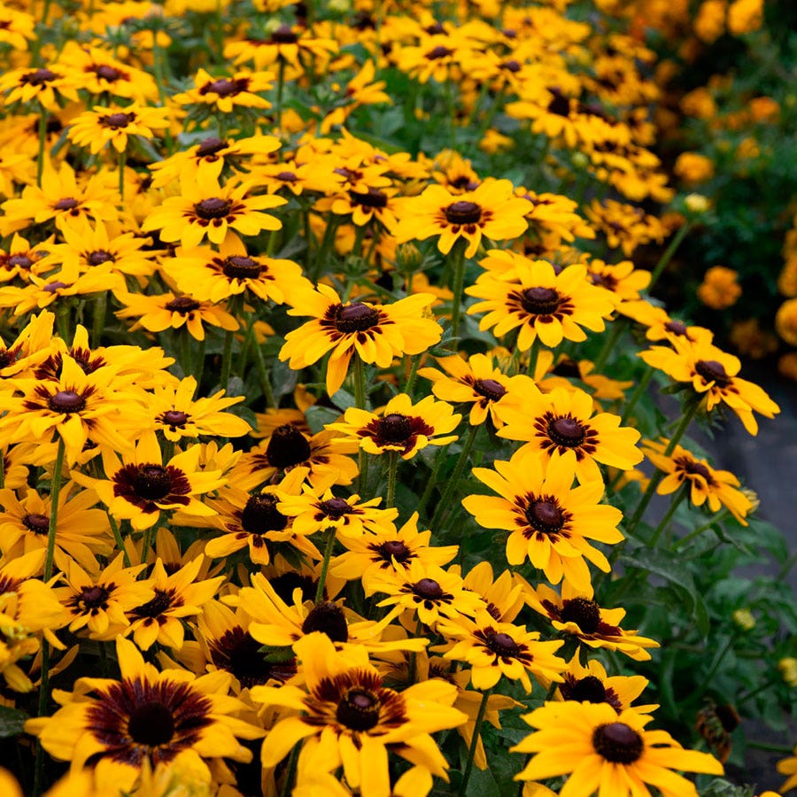 The compact sister of Denver Daisy, Pawnee Spirit Rudbeckia blooms summer through fall. Early, abundantly, and uniformly blooming, Pawnee Spirit sets daisylike 6-inch flowers with golden-yellow rays and a large rich-mahogany center and cone. Borne singly on sturdy stems that will not flop, the blooms make excellent long-lasting cut flowers. Bright and nectar-rich, the flowers attract bees and butterflies to the garden for months on end, and the seed heads that follow offer winter interest as well as sustenance for songbirds, such as American goldfinches.