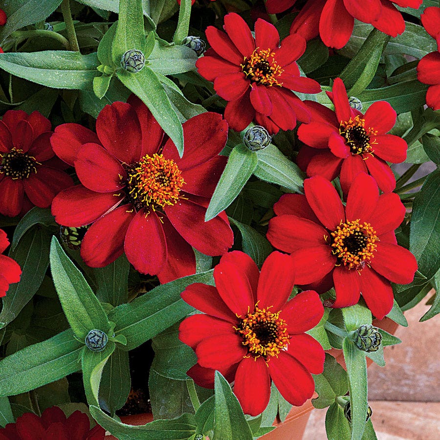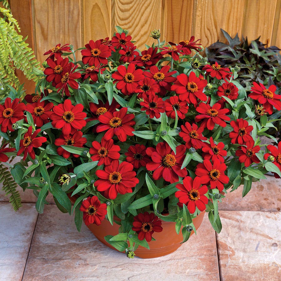 It's finally herea true red Zinnia. Masses of 2-inch blooms appear from late spring 'til frost on this mounded groundcover, attracting butterflies and bees. Winner of the highly coveted, scarce-as-hen's-teeth Fleuroselect Gold Medal, Profusion Red is the zinnia we've been waiting for.