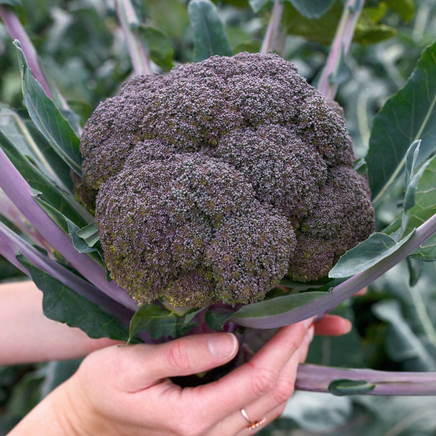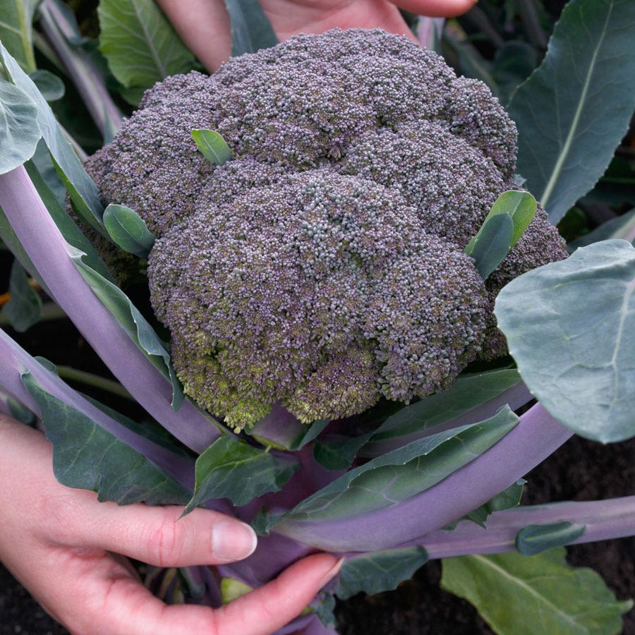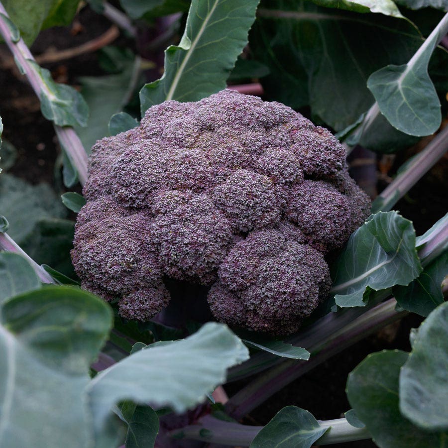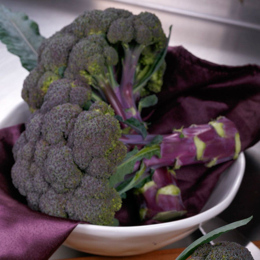Broccoli Purple Magic, an F1 hybrid, is a flower, or head, vegetable with very uniform, large, nicely domed heads with bright, tight beads and beautiful purple color that extends throughout the heads, stems, and leaves, making it an attractive option for an ornamental edible garden. It's more tender than traditional green broccoli and has a sweeter flavor. Broccoli is considered a superfood for its nutrient rich content.