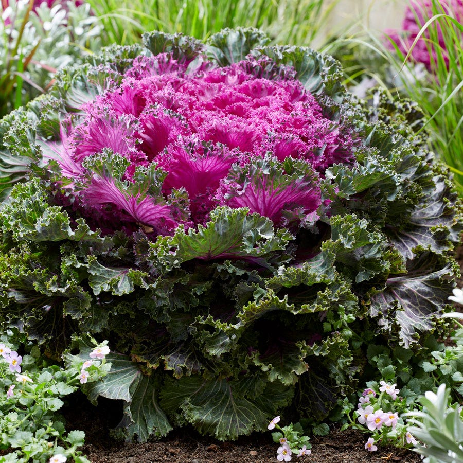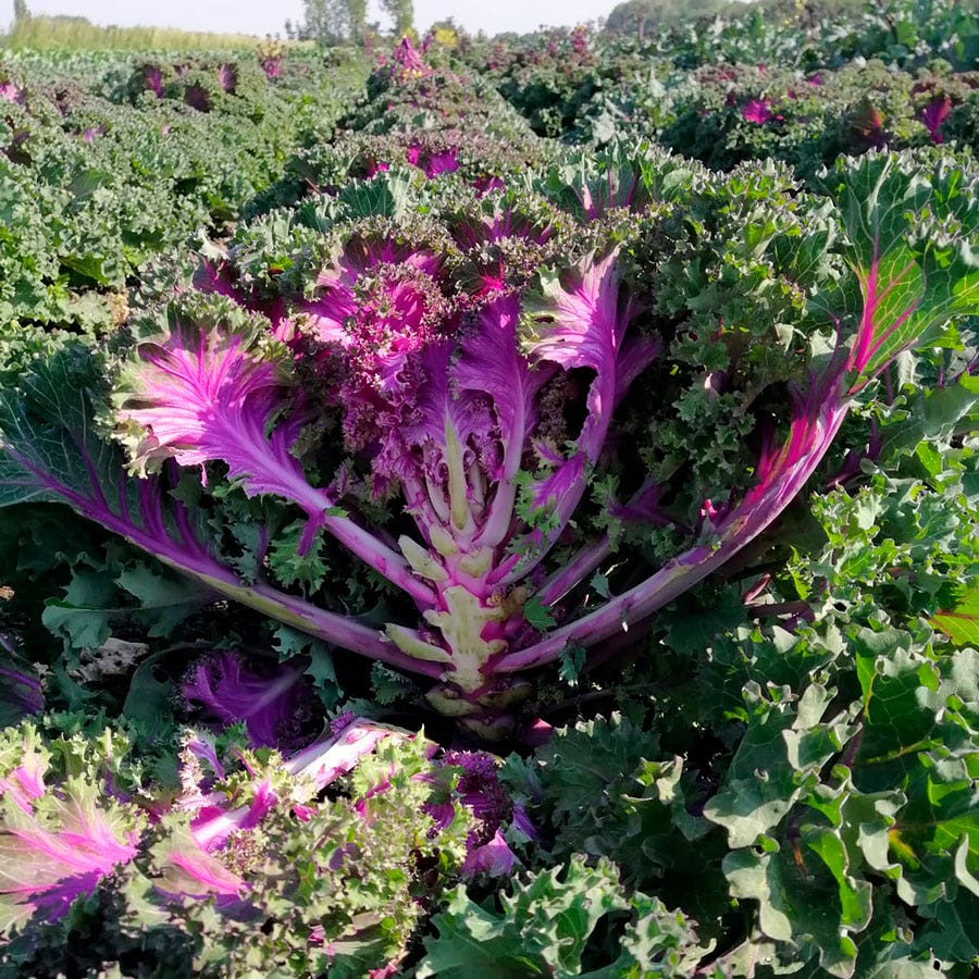An F1 hybrid, Rainbow Candy Crush Kale is an eye-catching edible ornamental kale that's both beautiful and delicious?perfect for an edible landscape. Compact and very leafy, each head weighs up to 6.5 pounds and has bright green edges and a bold hot pink and purple center, which gets more intense during cool nighttime temperatures. The wavy-edged leaves have a succulent, mildly sweet flavor when cooked or raw and are very thin and less fibrous than most other kales, which makes them an excellent choice for salads, slaws, kale chips, and for adding to smoothies. Kale is considered a superfood for its nutrient rich content.