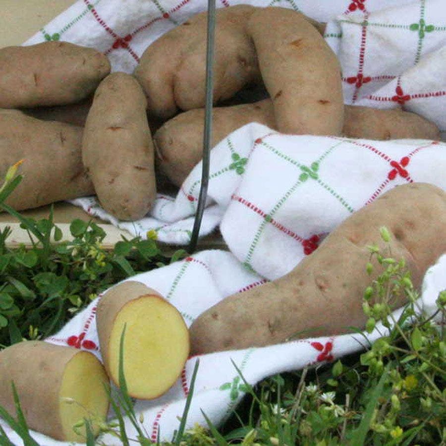 Part of 'Rose Finn Apple's great appeal comes from its looks. The skin is thin and pale pink, and the flesh a creamy yellow that promises to be rich and moist. Much smaller than traditional potatoes, these fingerlings are gourmet treats that are every bit as easy to grow as big ole plain brown types.