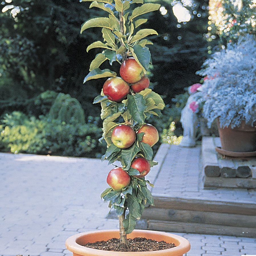 Malus spp. Scarlet Sentinel? is exceptionally disease-resistant and exceptionally productive, yielding very large, handsome fruit of red with greenish-yellow shoulders and white flesh. The crisp, sweet flavor of this Columnar Apple is invigorating.