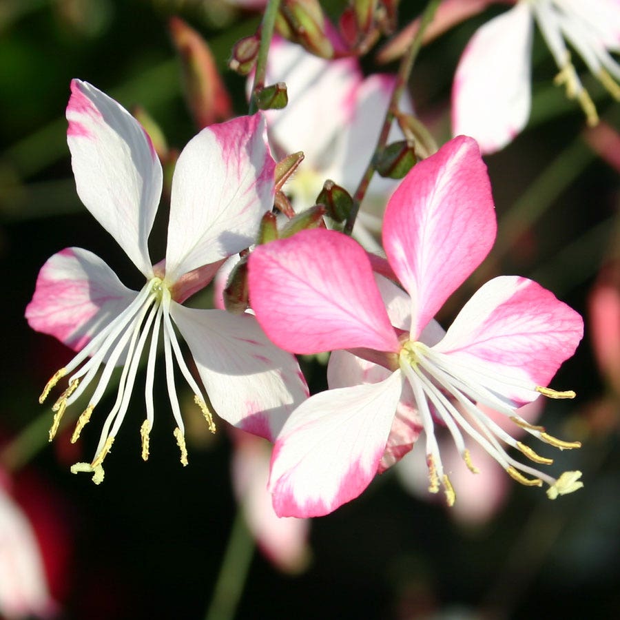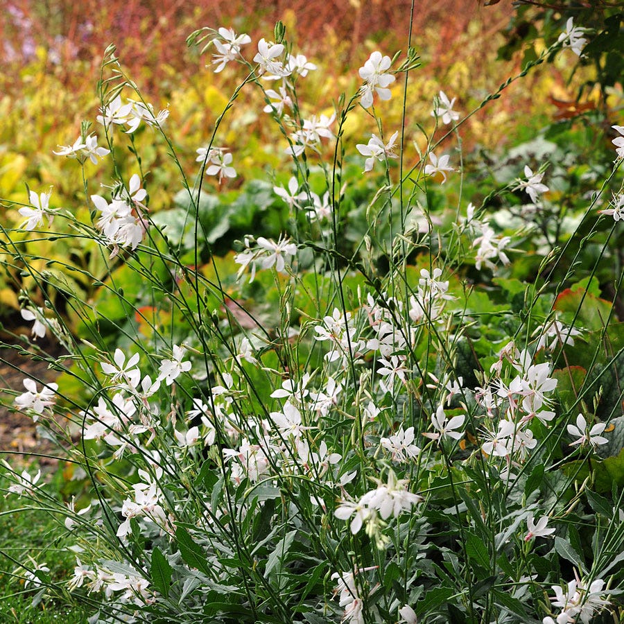 The first gaura ever to win an All-America Selection, Sparkle White is an arching, airy plant, with narrow 1- to 3-inch leaves and masses of long, slender stems set with 2-inch butterfly-shaped white and pink blooms. The wiry stems add lovely architecture to the border, while the blooms bring in butterflies and bees. Expect the first flowers in late spring (up to 3 weeks earlier than other varieties) from an indoor sowing. They'll continue all summer long, delighting you for months. And if you can cut the plant back after the first blooms pass, you'll get an even better-branched, more floriferous Sparkle White next year.