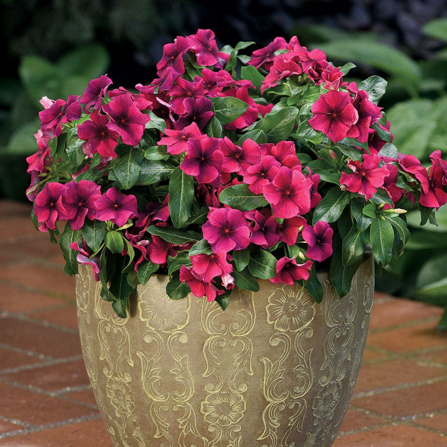 Here's a brand-new look for vinca you'll simply love: every bright bloom is "inked" around the center, as if it had eyelashes. Really eye-catching even in a small planting, the look is enhanced by large, overlapping petals on upright, bushy, well-branched plants. Tattoo will make you sit up and take notice.
