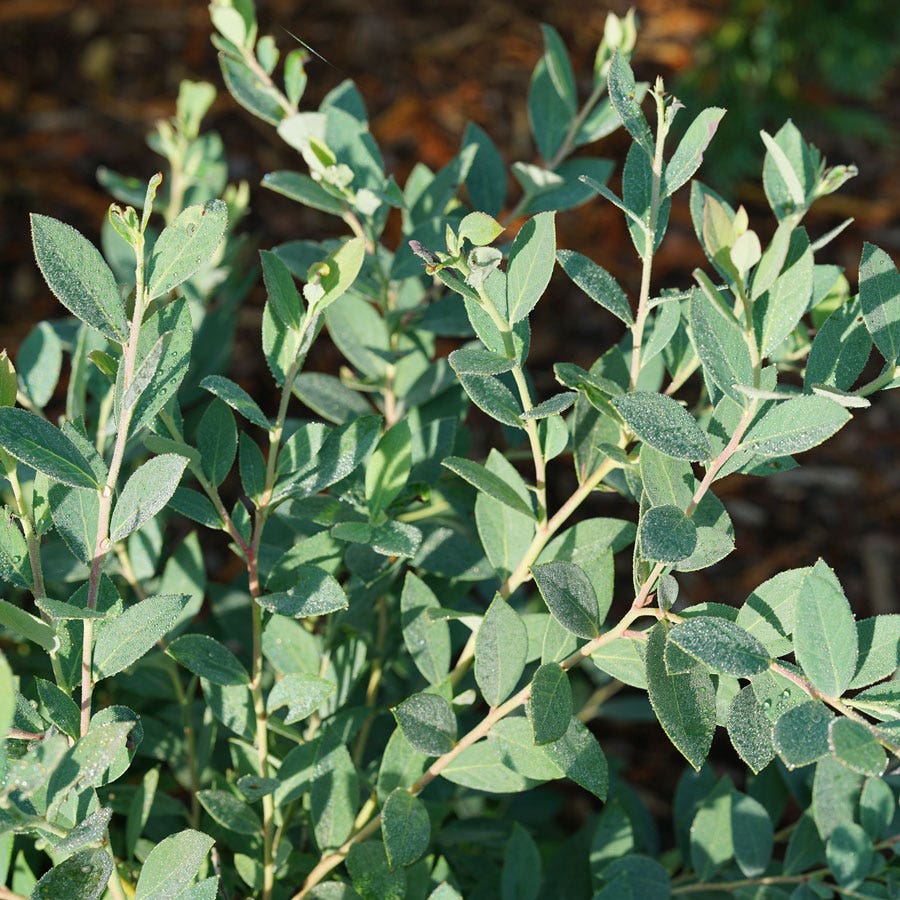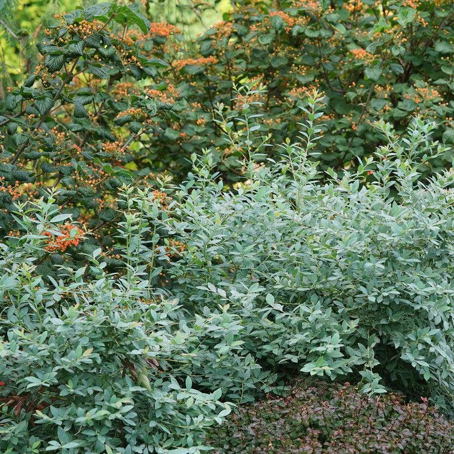 A Proven Winners? ColorChoice? Flowering Shrubs variety, Vaccinium Splendid!? Blue is a highbush blueberry cultivar valued not only for fruit production but also for ornamental purposes. Tidy and attractive, the deciduous shrub grows into a rounded mound, 4 feet tall and 4 feet wide, that maintains handsome dusky blue foliage throughout summer, which complements most plant colors in the garden, including red and orange. A mid-season variety, Splendid! Blue blooms in lovely small white flowers in late spring that attract pollinators, including bees and butterflies, followed by clusters of very sweet and flavorful blueberries that ripen midsummer, attracting birds.