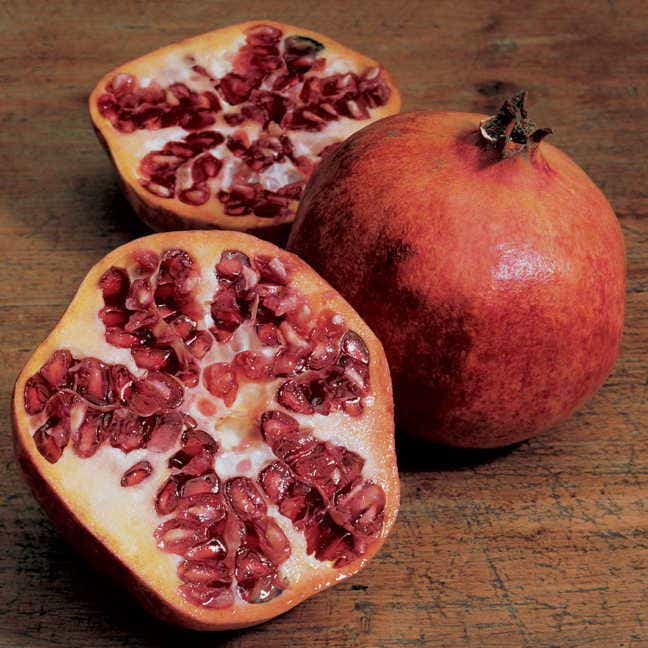 Many scientific studies have touted the anti-oxidant benefits of pomegranates. This cultivar is called "Wonderful" for a good reason. Big crimson fruits ripen in late fall on this terrific overachiever. The finest quality, largest, and most highly colored of all pomegranates (and in this ornamental family, that's really saying something!), this wonderful plant grows quickly into an 8-foot bush. It thrives under just about any conditions, from windy, moist coastal settings to the still, dry, hot desert! he fruit of "Wonderful" is unsurpassed in size and vibrant color.
